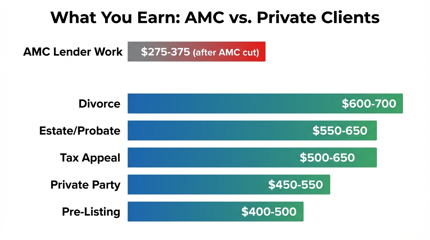 When you do private work, there is no AMC. You're being hired directly by the attorney, the homeowner, or the CPA. The full fee goes to you. Your pricing should reflect the direct service model, not the intermediary model.