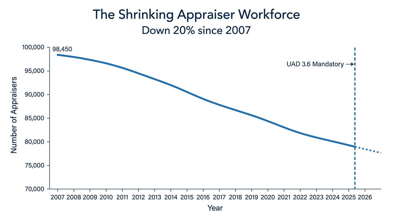 The appraiser workforce has been shrinking for nearly two decades. The profession peaked at about 98,450 appraisers in 2007. Today that number is roughly 78,800. That's a 20% decline in less than 20 years.