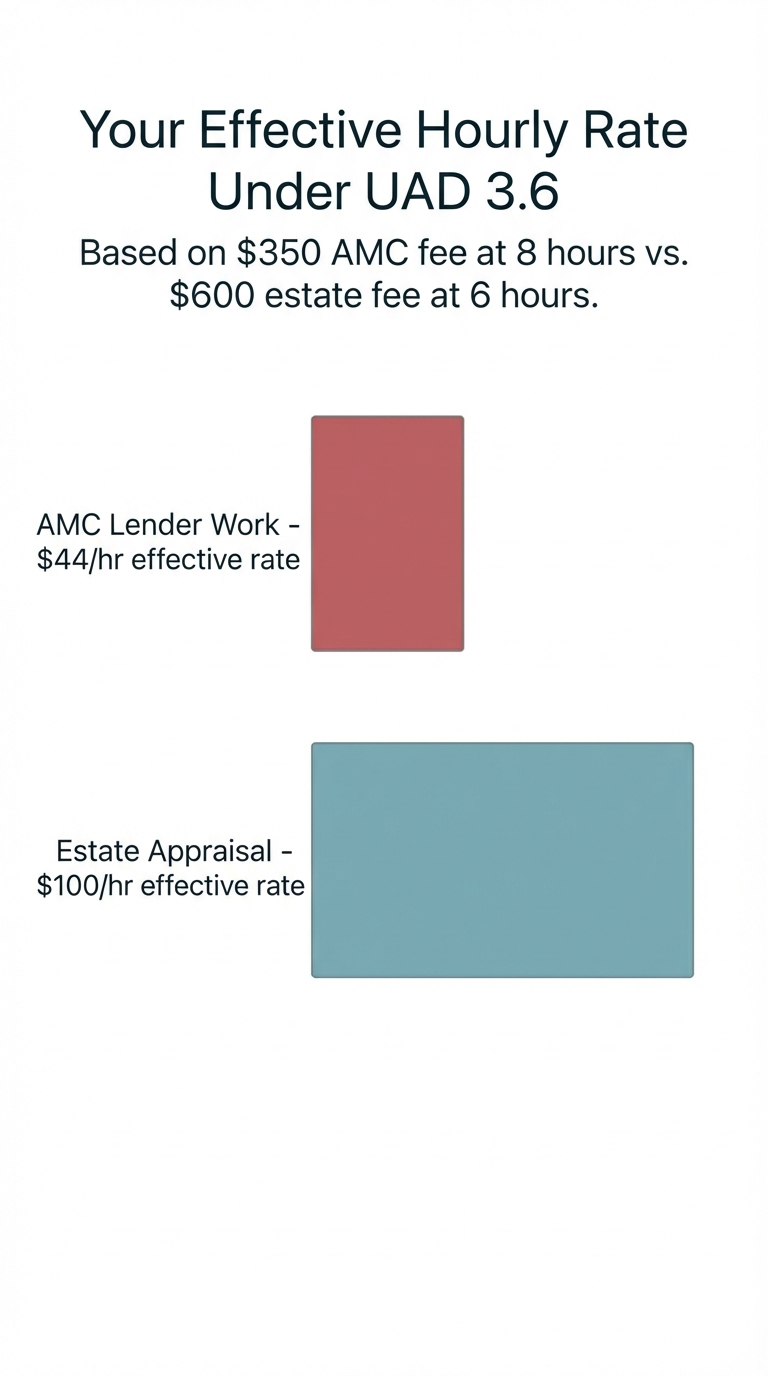 If your average AMC order pays $350 and a UAD 3.6 report takes you 8 hours instead of 6, your effective hourly rate just dropped from about $58/hour to about $44/hour. That's before overhead.